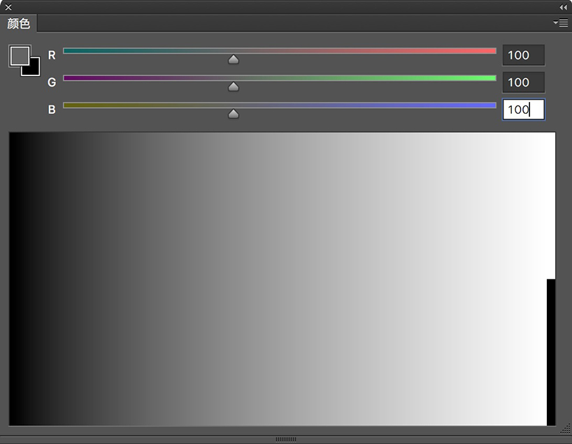 把RGB全部調(diào)成255,是全白(等于灰度模式0%);全部調(diào)成0,是全黑(等于灰度模式100%)。點擊右上角下來箭頭,選擇灰度模式對比一下是不是這樣的。