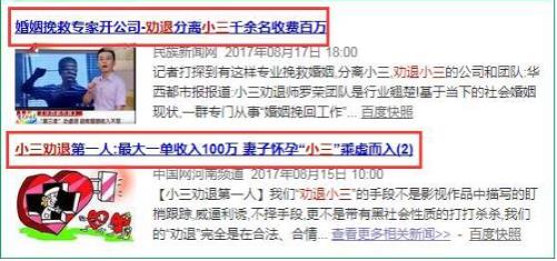 其中,以重慶某婚姻家庭咨詢服務(wù)中心主任,一年通過自己長達(dá)10余年的情感咨詢經(jīng)驗(yàn),勸退了上千個(gè)“乘虛而入”的“小三”,把上千個(gè)家庭從破碎的邊緣拯救了回來。更令人震驚的是,這位主任在勸退小三的業(yè)務(wù)中,最高的1單收入超過了100萬,而且還被媒體報(bào)道。